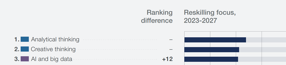 In the 2023 World Economic Forum jobs report, ‘AI and big data’ ranks third on the list of reskilling-upskilling priorities across all organisations for 2023-2027. This was the biggest mover from last report, shifting 12 places, and only just behind the top two priorities of creative thinking and analytical thinking.